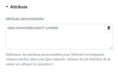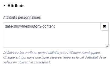 L’attribut est composé comme ceci : data-showme="bouton1-content". Le début (data-showme) servira de repère pour le JavaScript, et la seconde partie est l’identifiant (l’ID que l’on va utiliser pour lier le bouton au conteneur).