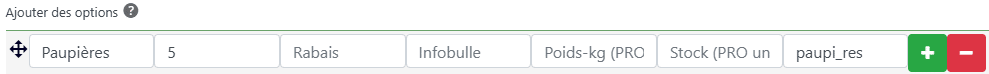 • Poids (Weight) : Attention, ne confondez pas avec le prix ! Si votre option alourdit le colis (ex: une grosse pièce en métal), indiquez son poids ici pour que les frais de port soient recalculés correctement.